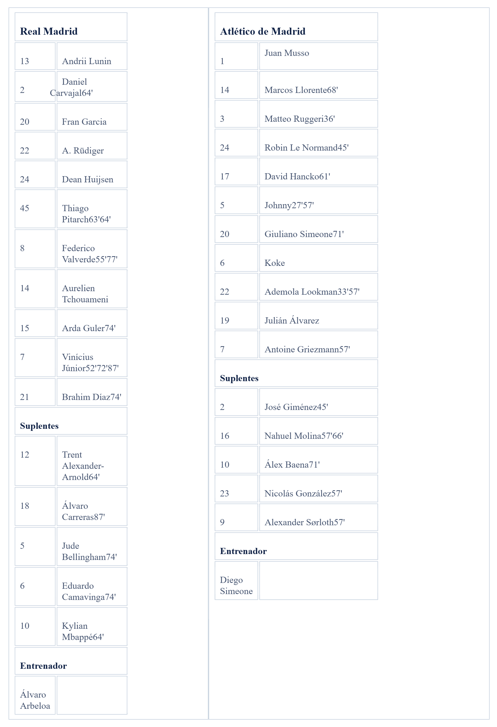 Transcurrían los minutos y en el 66’ empató el Atlético con un gran gol de Molina. Y del tanto visitante pasamos seis minutos después al 3-2, que no le fue a la zaga en cuanto a belleza. Trent arrancó desde su campo y entregó el esférico a Vini Jr., que, escorado, controló, lo condujo sobre la línea de la frontal y sacó un disparo ajustadísimo, ante el que nada pudo hacer Musso en el 72’. Segundo doblete del brasileño en los dos últimos encuentros.