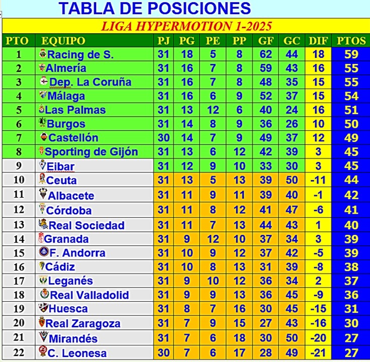 En cuanto a la segunda división o Liga Hypermotion, Racing de Santander cayo por goleada, pero sus ahorros lo mantienen liderando la tabla de la clasificación, resumimos ambas categorías.